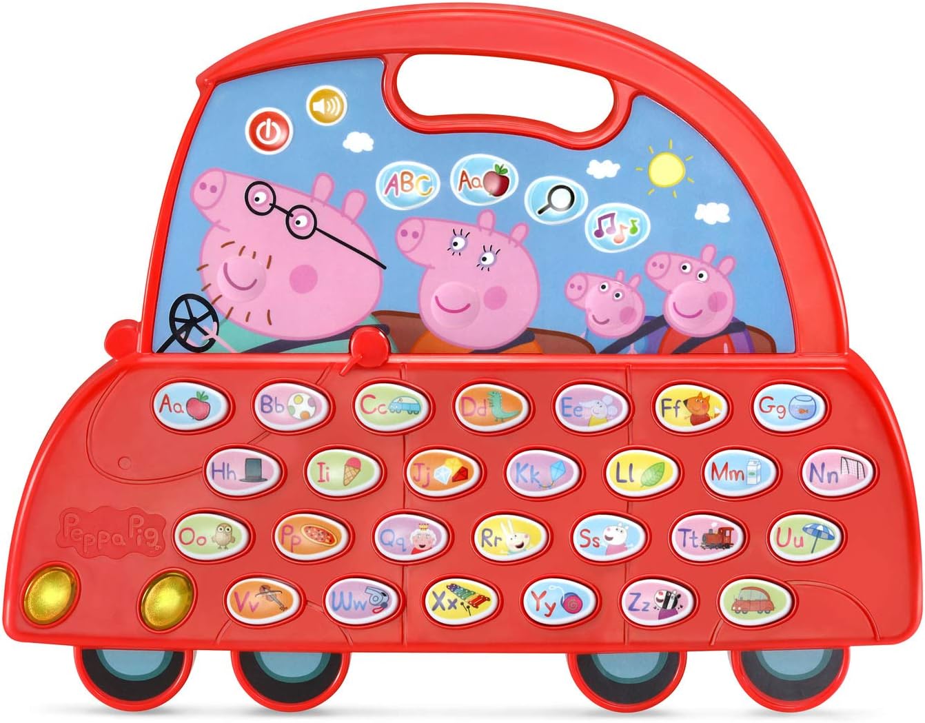 In Learning Words mode, Peppa Pig teaches a word with every letter; press the Family Car button to hear her talk about safety rules like buckling up your seatbelt and obeying traffic lights
